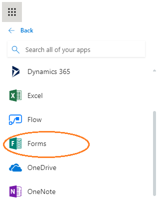 Figure .2 : Office 365 – Microsoft Forms – Open Forms App - If you click App Launcher, click All Apps and then open Forms from the given list of left navigation.