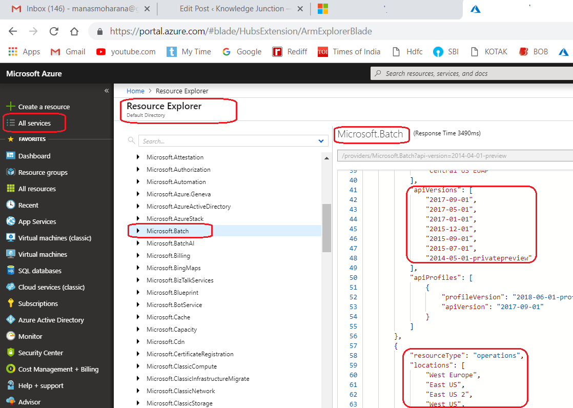 Figure 3: Azure – Solution Explore Service - Once we are on Resource Explore page, expand Providers and select a registered resource provider. For example, here we would select “Microsoft.Batch” provider to see the Locations and API versions of its resource type. We have already seen the same information using PowerShell and Azure CLI in our last article. As shown in the following figure, we can see teh details of “Microsoft.Batch” provider.