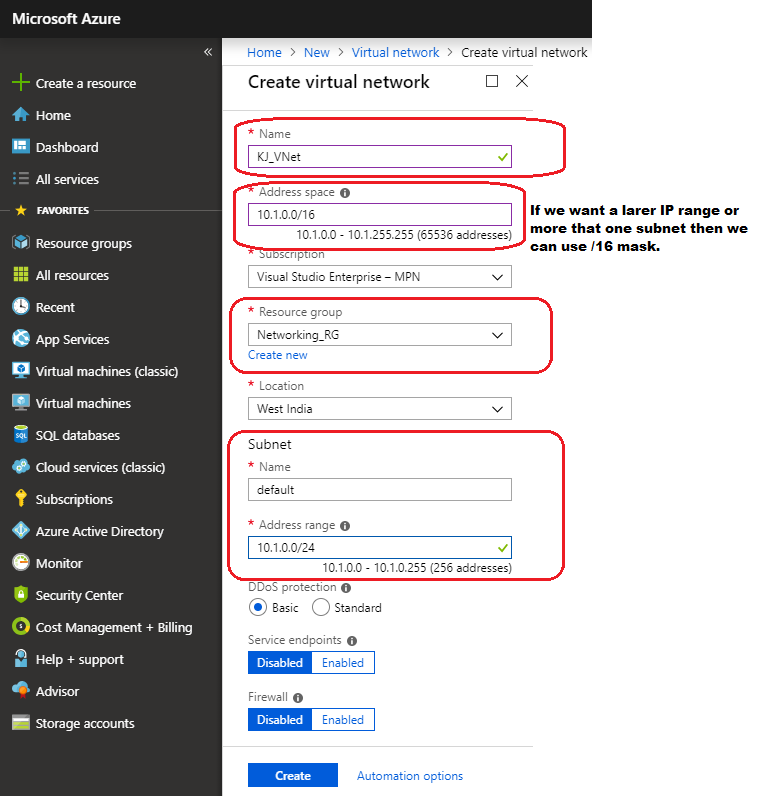 One more important information need to be set. One is Virtual Network address space . One should think and planed well before creating the V-Net. It Specifies the number of the IPs provided by the virtual network. There is a calculation on this by considering teh IP mask. By default the Vnet Address space is 10. 1.0.0/16. This means, the first two section is fixed and the Vnet will provide the address between 10.1.0.0 to 10.1.256.256 (65536 addresses). And later we will see how can we divide the total address among multiple Subnets.