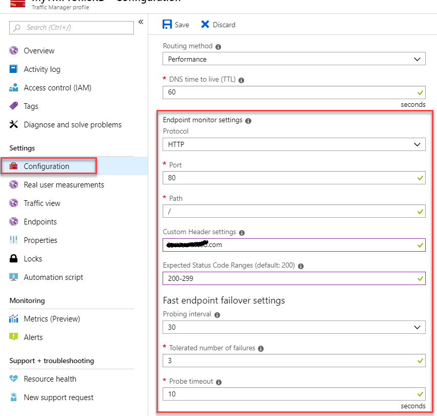 Azure Traffic Manager includes built-in endpoint monitoring and automatic endpoint failover. Which help us to deliver high-availability applications by checking the health of the endpoint and immediately switch to a different healthy available endpoint . Following major properties need to be configured, when configuring an end point monitoring as in following figure.