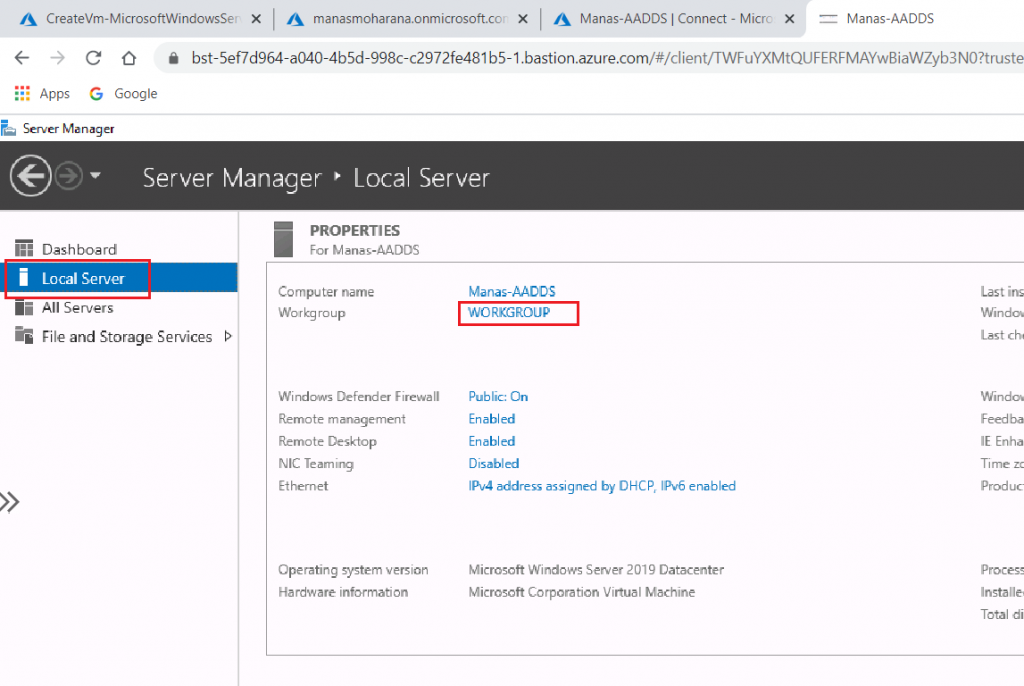 Step 10 – After restarting the VM, we can connect to the VM using a user of managed domain. As we can see, in the following figure, now the VM is under the manasmoharana.onmicrosoft.com domain.
