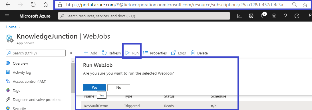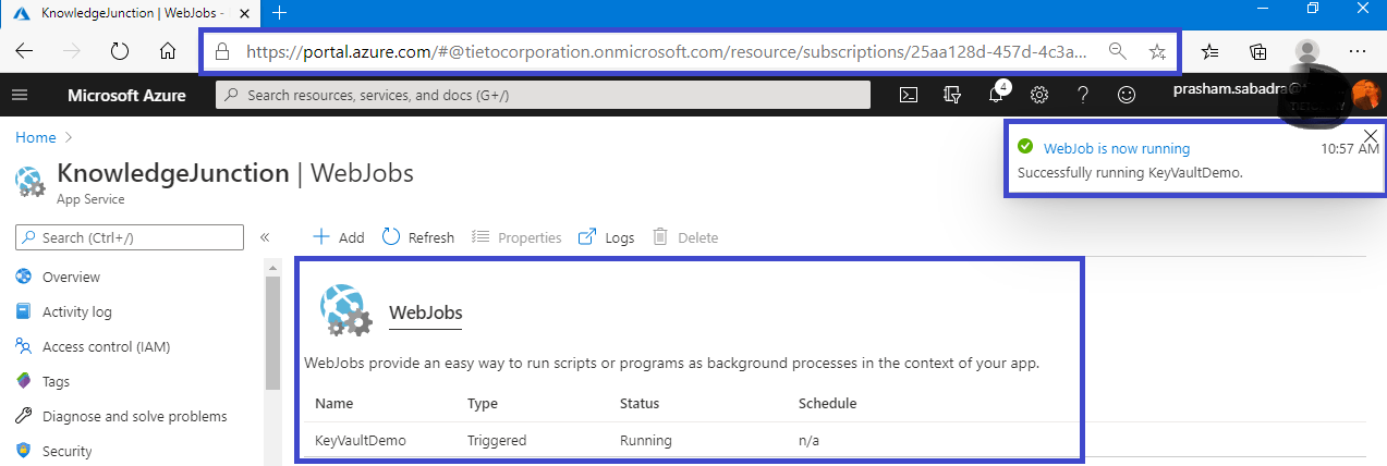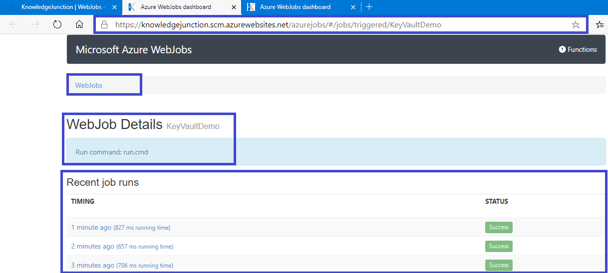 - From “WebJob Run Details” page we have various options like “Toggle Output” button, “download” option to download the report in text file – it generate URL like https://knowledgejunction.scm.azurewebsites.net/vfs/data/jobs/triggered/KeyVaultDemo/202007310257000254/output_log.txt