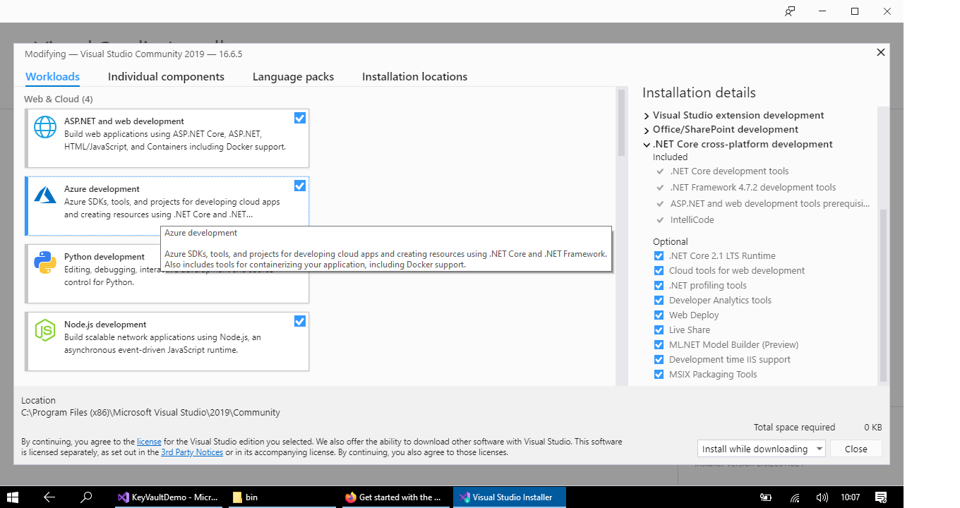 - Visual Studio 2019 with Azure development feature installed as shown in below Fig