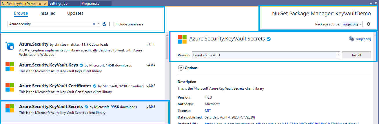 Azure - .Net Core console application - installing NuGet package - Azure.Security.KeyVault.Secrets