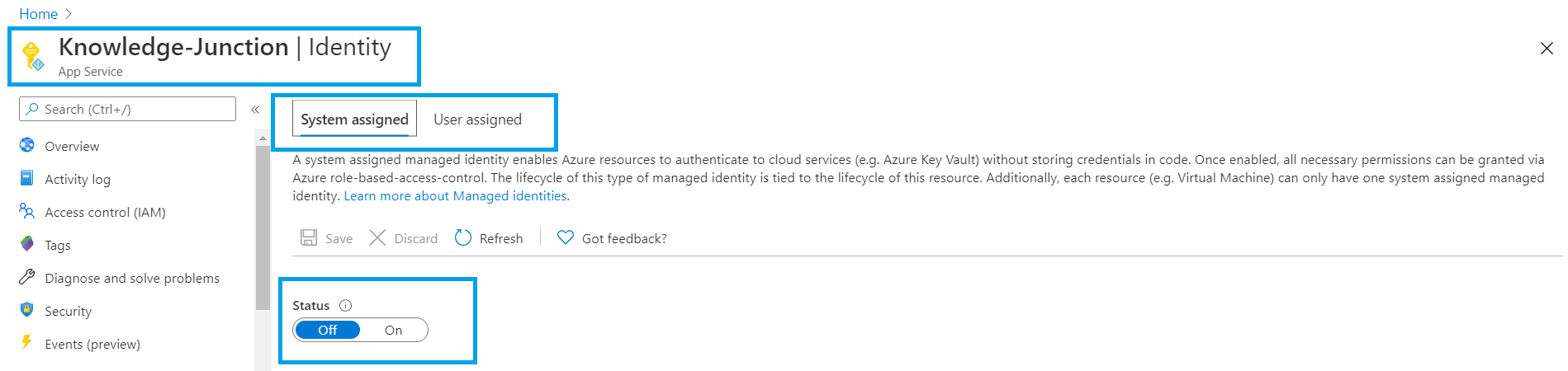 Fig : Azure – App Service – Enabling the Identity for App Service