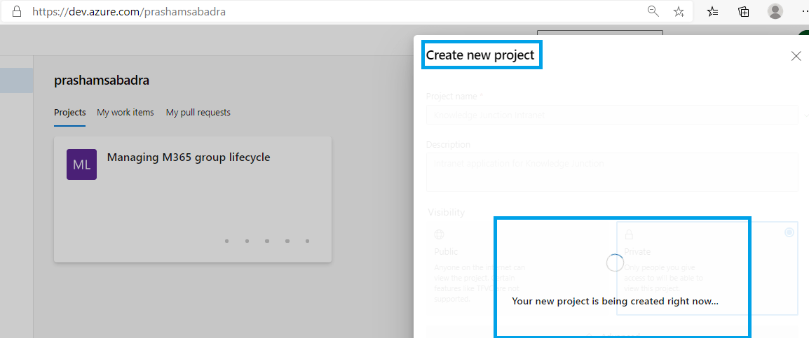 - To create new project go on Azure DevOps home page – https://dev.azure.com/<organization name>, here we have https://dev.azure.com/prashamsabadra