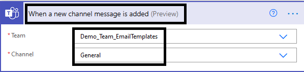 - Our next step will be posting message in Team channel as shown in below Fig. Here we are posting message in Team – “Demo_Team_EmailTemplates” and in “General” channel which is selected while adding PowerAutomate action as shown in below Fig