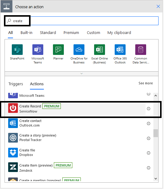 - Our next step will be adding ServiceNow “Create record” action to create the ServiceNow incident as in below Fig