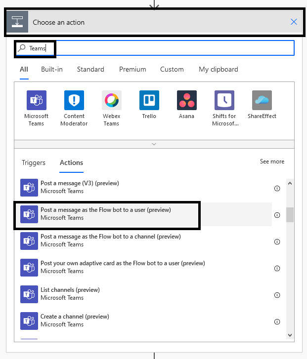 - There is a Teams action called “Post a message as the Flow bot to a user (Preview)” as