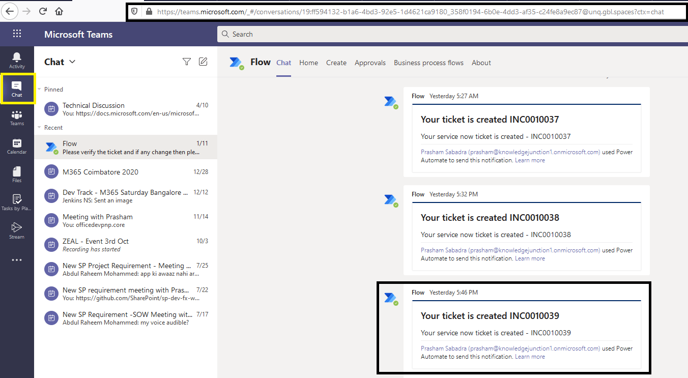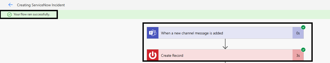 When you will add a message in given teams, Power Automate will be triggered, ServiceNow incident will be created and incident number is posted back to respective user as