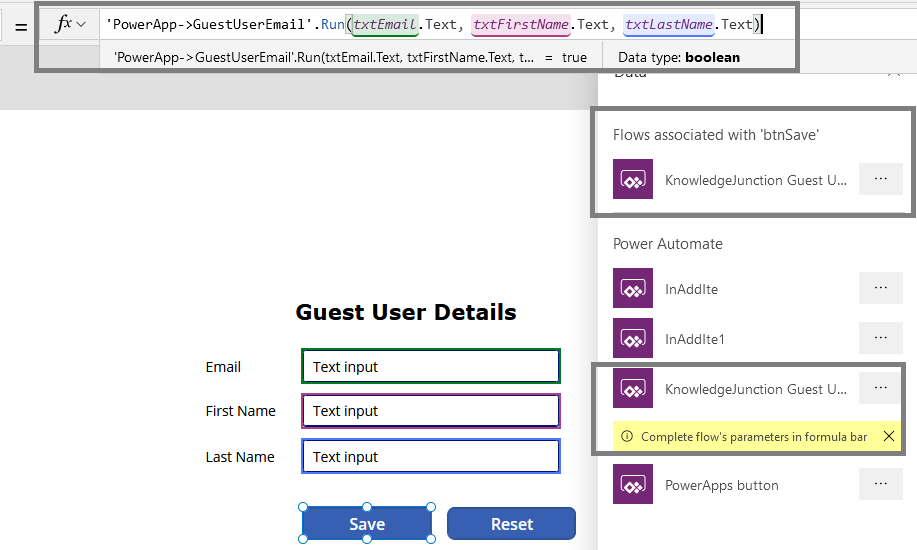 'PowerApp->GuestUserEmail'.Run(txtEmail.Text,txtFirstName.Text,txtLastName.Text)