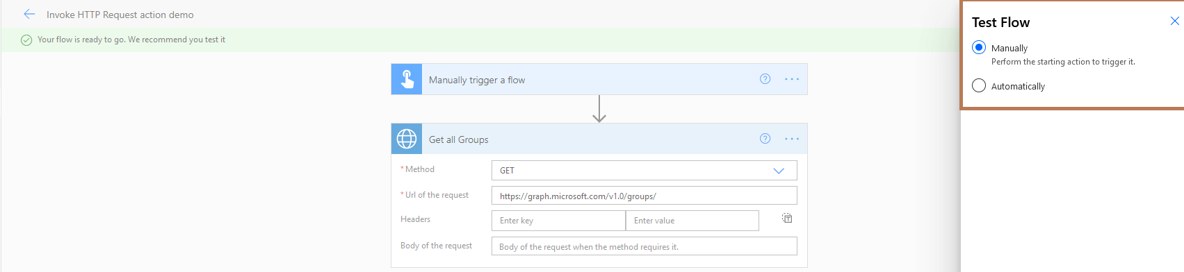- Click on “Test Flow” from right side pane and select option “Manually” as shown in below Fig