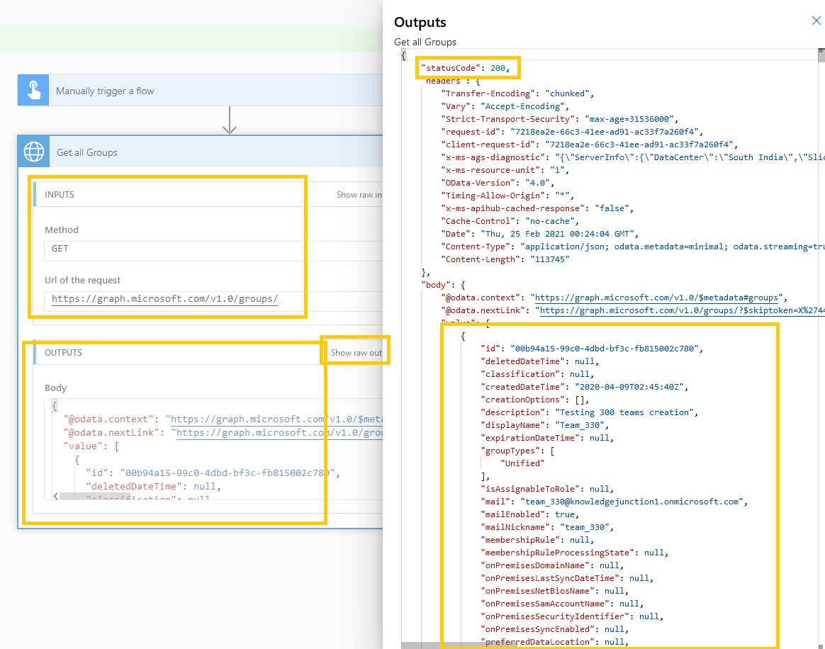 - Here, in “outputs” expression ‘Get_all_Groups’ is the action name which we renamed from “Invoke HTTP request” to “Get all Groups”