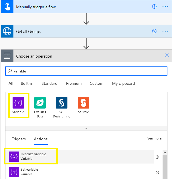 - Lets add new action “Initialize variable” as shown in below Fig