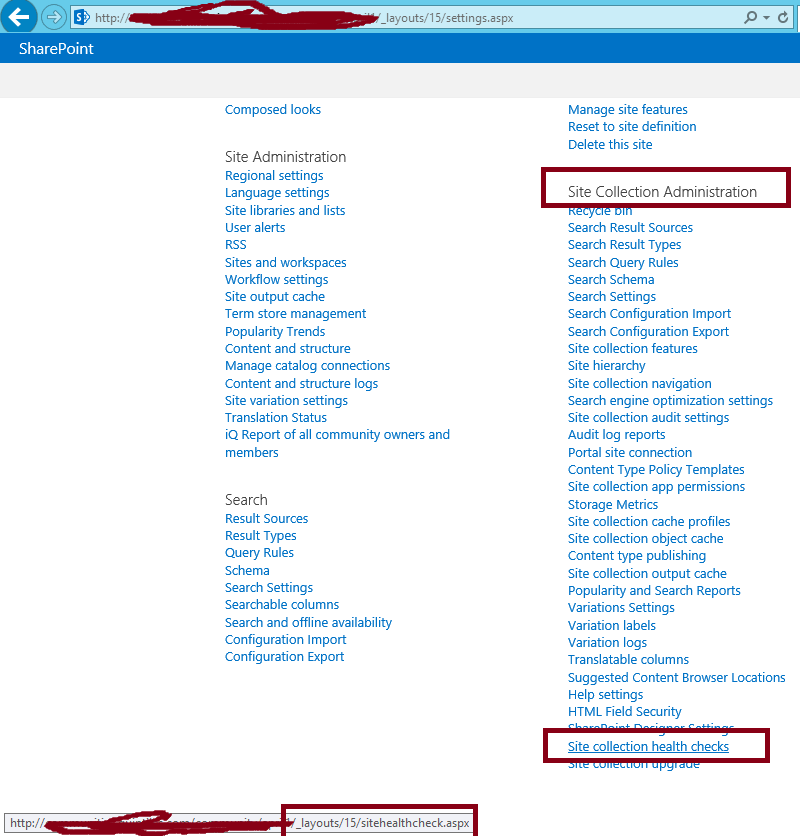 - – On Settings page in second column under the row “Site Collection Administration“, click on the link “Site collection health checks” as shown in below fig
