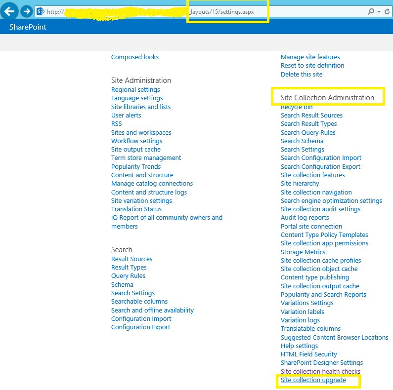 - On Settings page in second column under the row “Site Collection Administration“, click on the link “Site collection upgrade” as shown in below fig