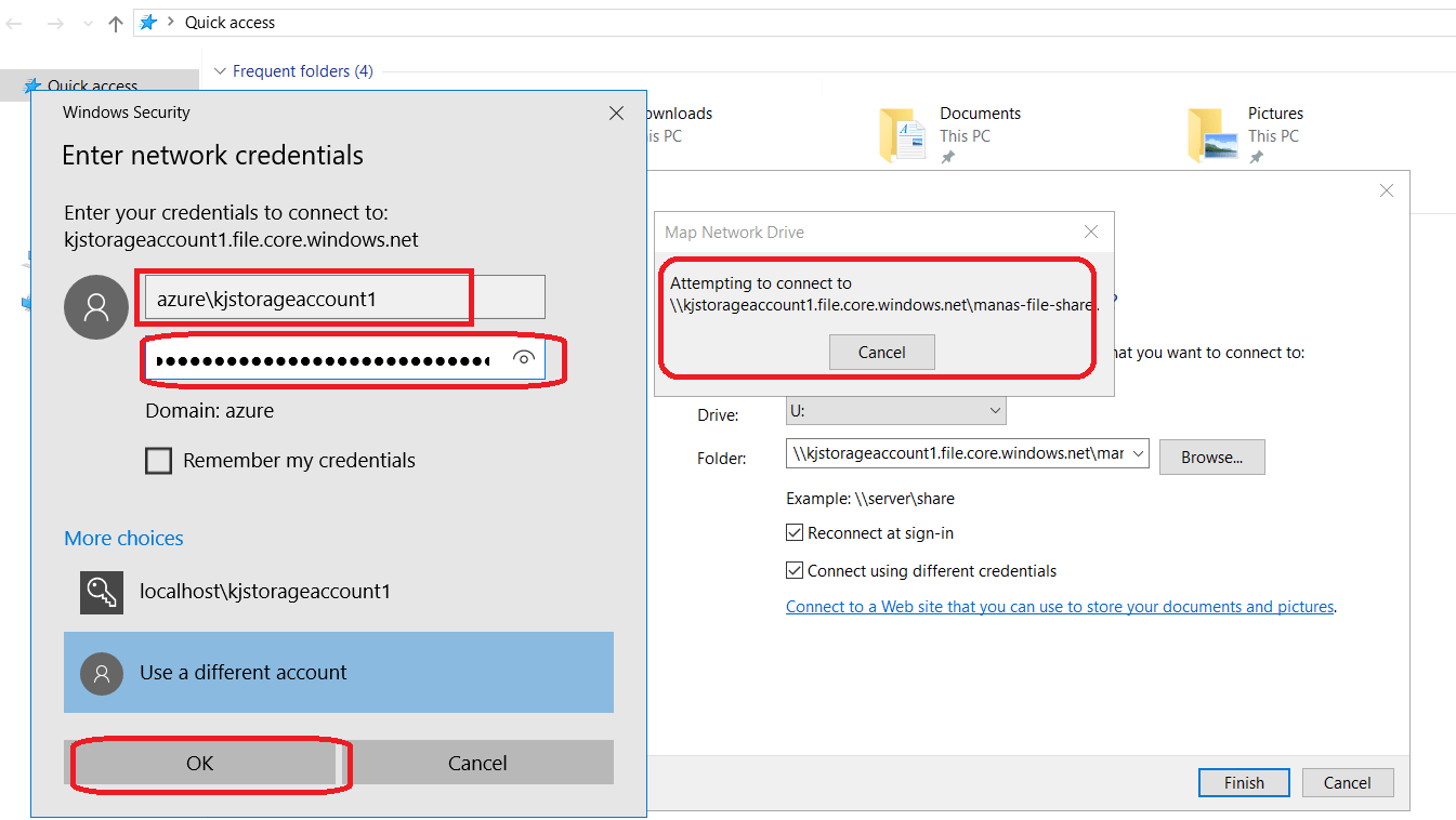 Step 7 – As we discussed in the above Step 3, by default, the user id is our Storage Account name and the password is the account key of the Storage Account. We have copied them in our above step. So now as sowing in the following figure provide those credentials and press Ok button.
