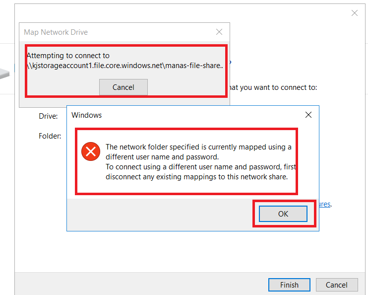 Step 8 – In the following figure we can see that, we got one notification as “The network folder specified mapped using a different user name and password.“