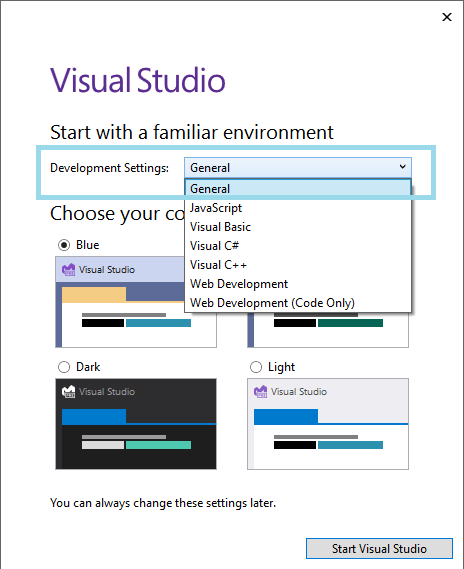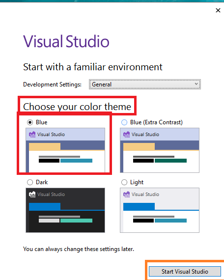 - Also select the your favorite color for coding 🙂 and then click on “Start Visual Studio” button as shown in below Fig