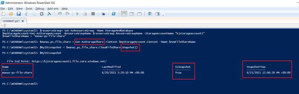 There is no direct command in PowerShell to create a file share snapshot. We can create a share snapshot for a file share by the Snapshot method on PowerShell object for a file share. Let’s go through the steps.