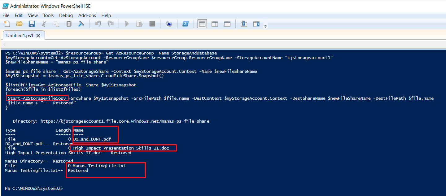 Start-AzStorageFileCopy -SrcShare $My1Stsnapshot -SrcFilePath $file.name -DestContext $myStorageAccount.Context -DestShareName $newFileShareName -DestFilePath $file.name
