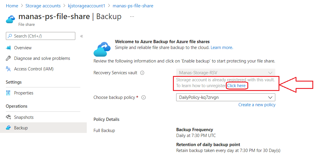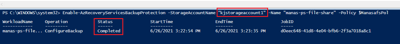 Enable-AzRecoveryServicesBackupProtection -StorageAccountName "kjstorageaccount1" -Name "manas-ps-file-share" -Policy $ManasafsPol