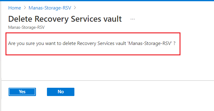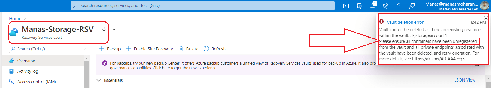 Then I tried to delete my old Recovery Service Vault but as we can see in the following figure, it doesn’t allow me to do so because, it found existing resource within the vault and it asked to first unregister the resource and then try to delete.