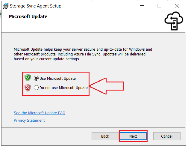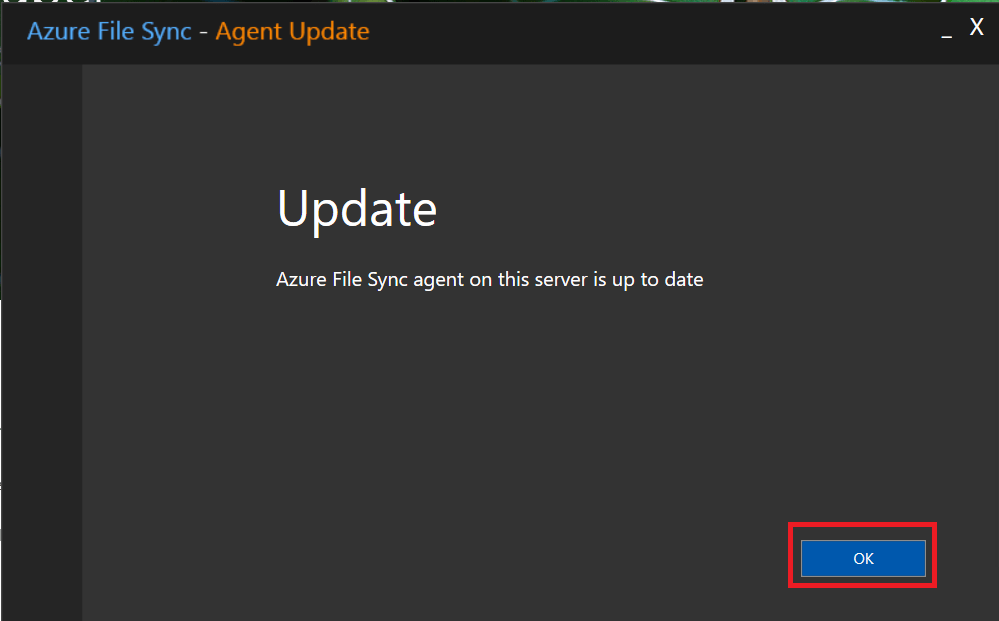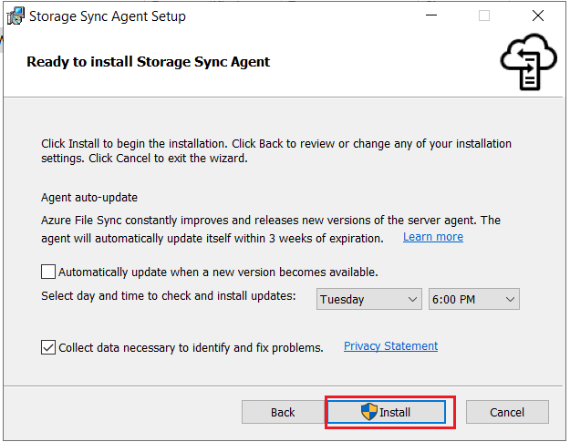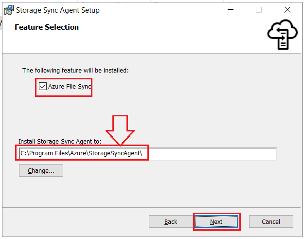 Microsoft Recommendation : Leave the default installation path (C:\Program Files\Azure\StorageSyncAgent), to simplify troubleshooting and server maintenance and enable Microsoft Update to keep Azure File Sync up to date. All updates, to the Azure File Sync agent, including feature updates and hotfixes, occur from Microsoft Update. We recommend installing the latest update to Azure File Sync. For more information, see Azure File Sync update policy.
