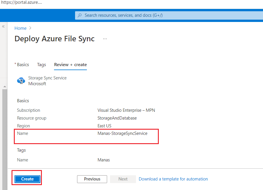 - Subscription : The subscription in which we want to create the Storage Sync Service.