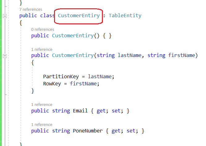 Following is our custom Customer class which derived from TableEntity class. We will use this class to define a new customer entity.