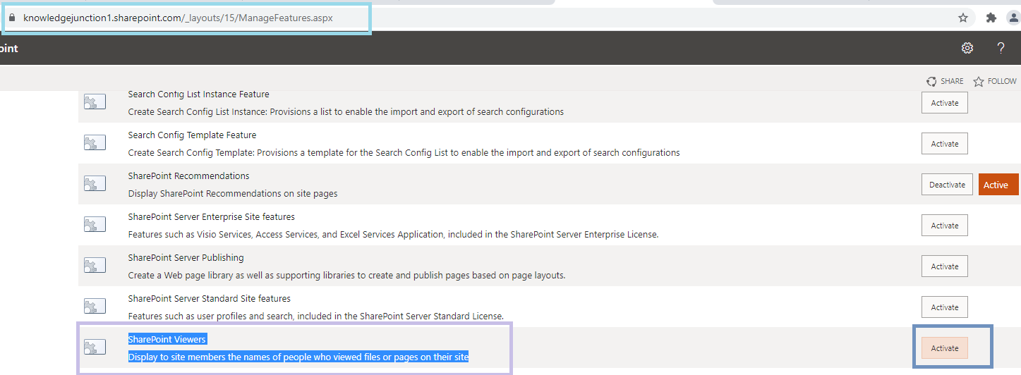Fig : Microsoft 365 - SharePoint Online - activating site level feature - "SharePoint Viewers"