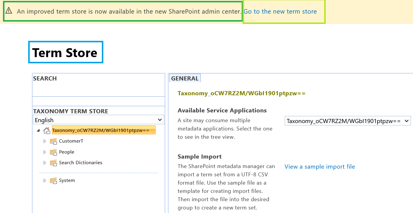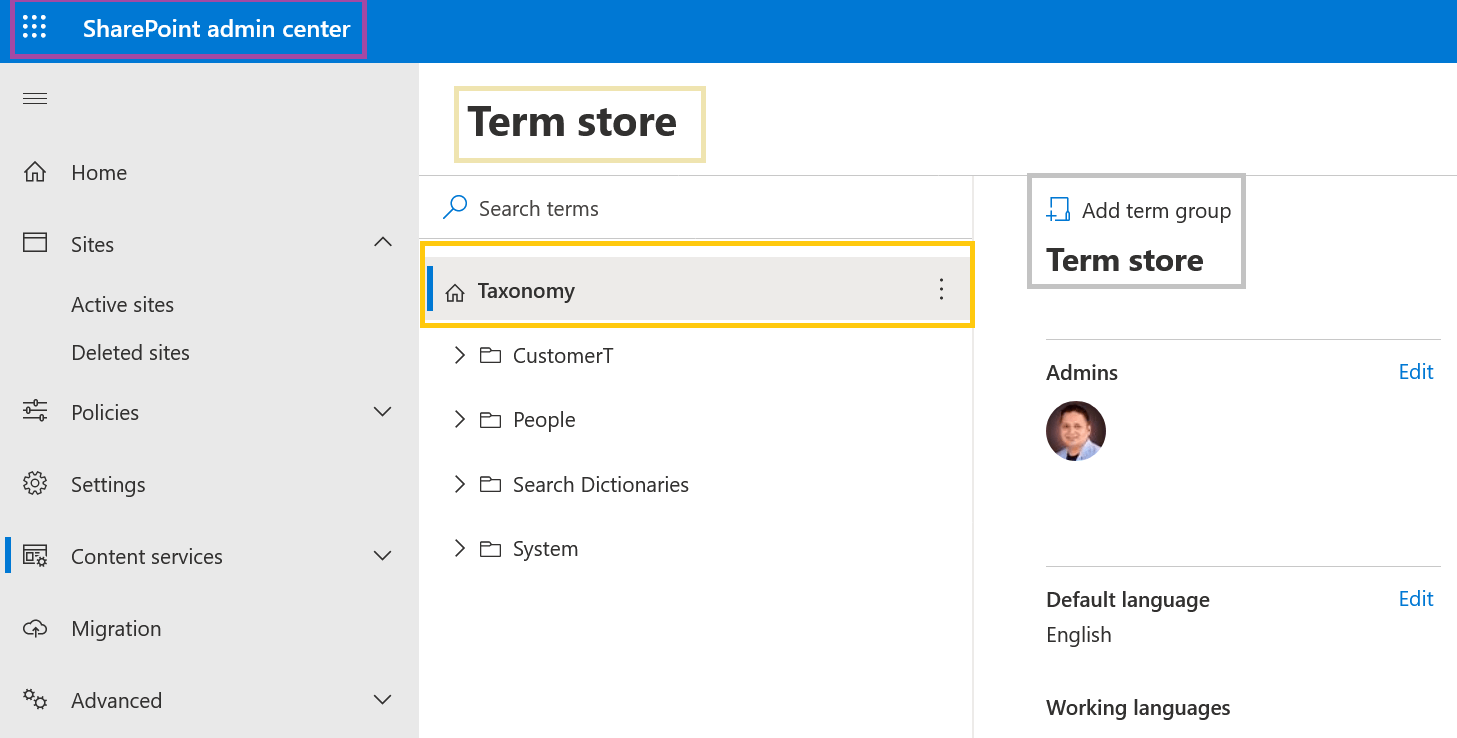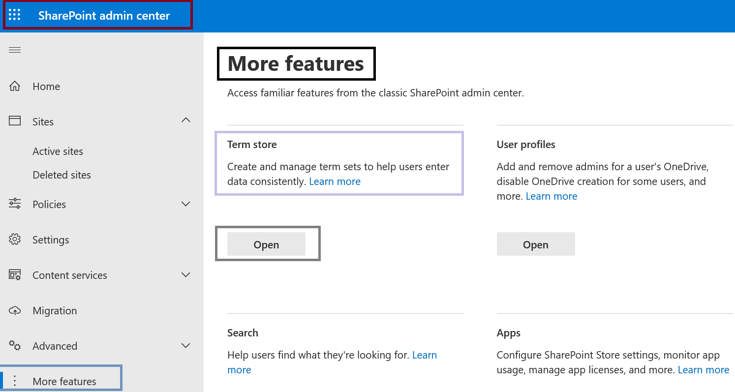 - Navigate to Term store manager from SharePoint Admin Center – https://<tenant>-admin.sharepoint.com/_layouts/15/online/AdminHome.aspx#/classicFeatures