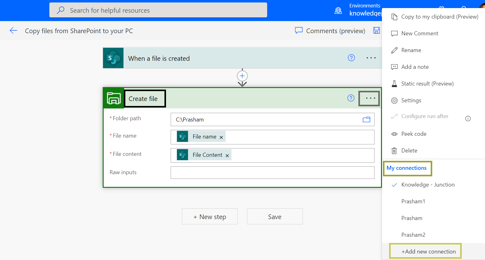 - Next, we will use action called – “Create file” – here we create connection to file system and selecting the folder where we need to download the respective file from the respective selected document library