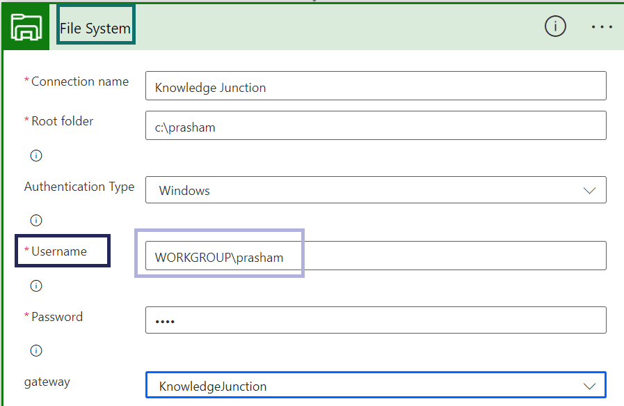 - Connection details – “File system” connection details – Data >> Connections