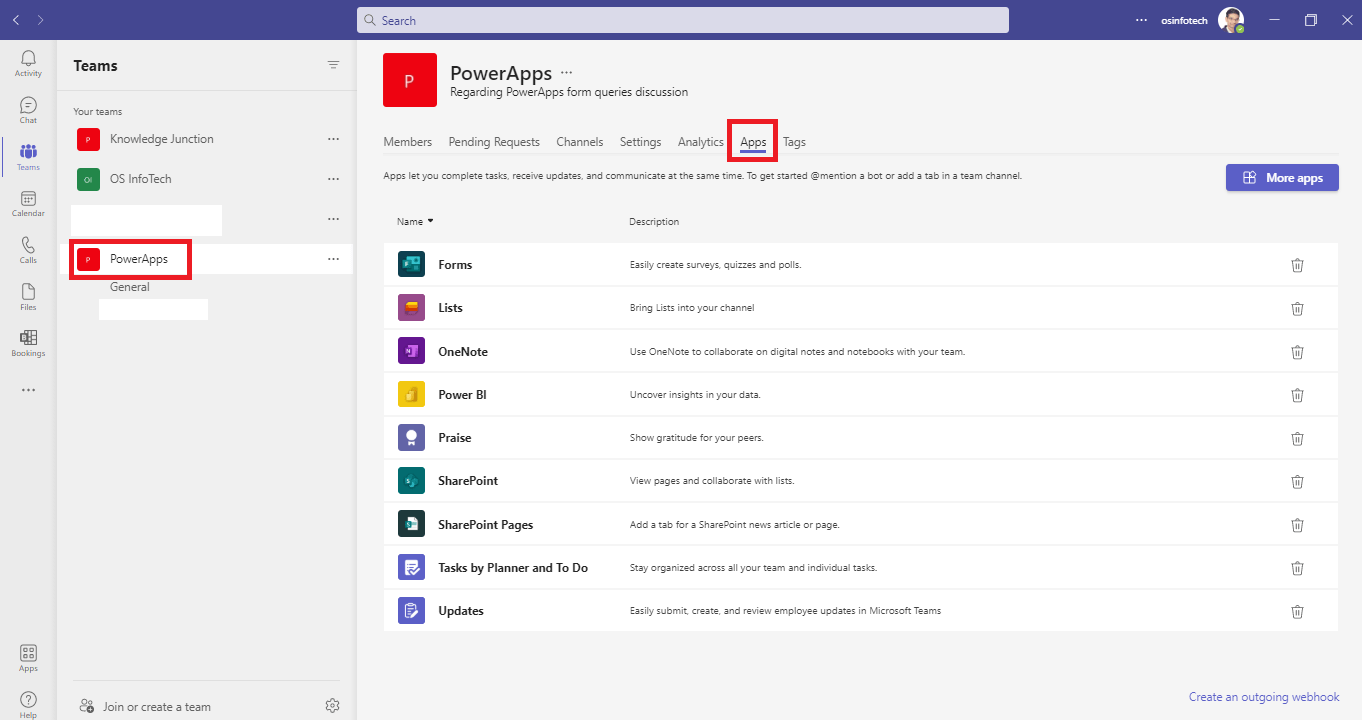 - In the Apps tab, we can install and manage the apps our team uses.