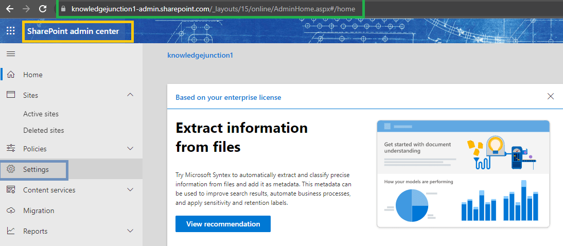 - On click of we will be navigated to “Settings” blade (_layouts/15/online/AdminHome.aspx#/settings) – https://knowledgejunction1-admin.sharepoint.com/_layouts/15/online/AdminHome.aspx#/settings