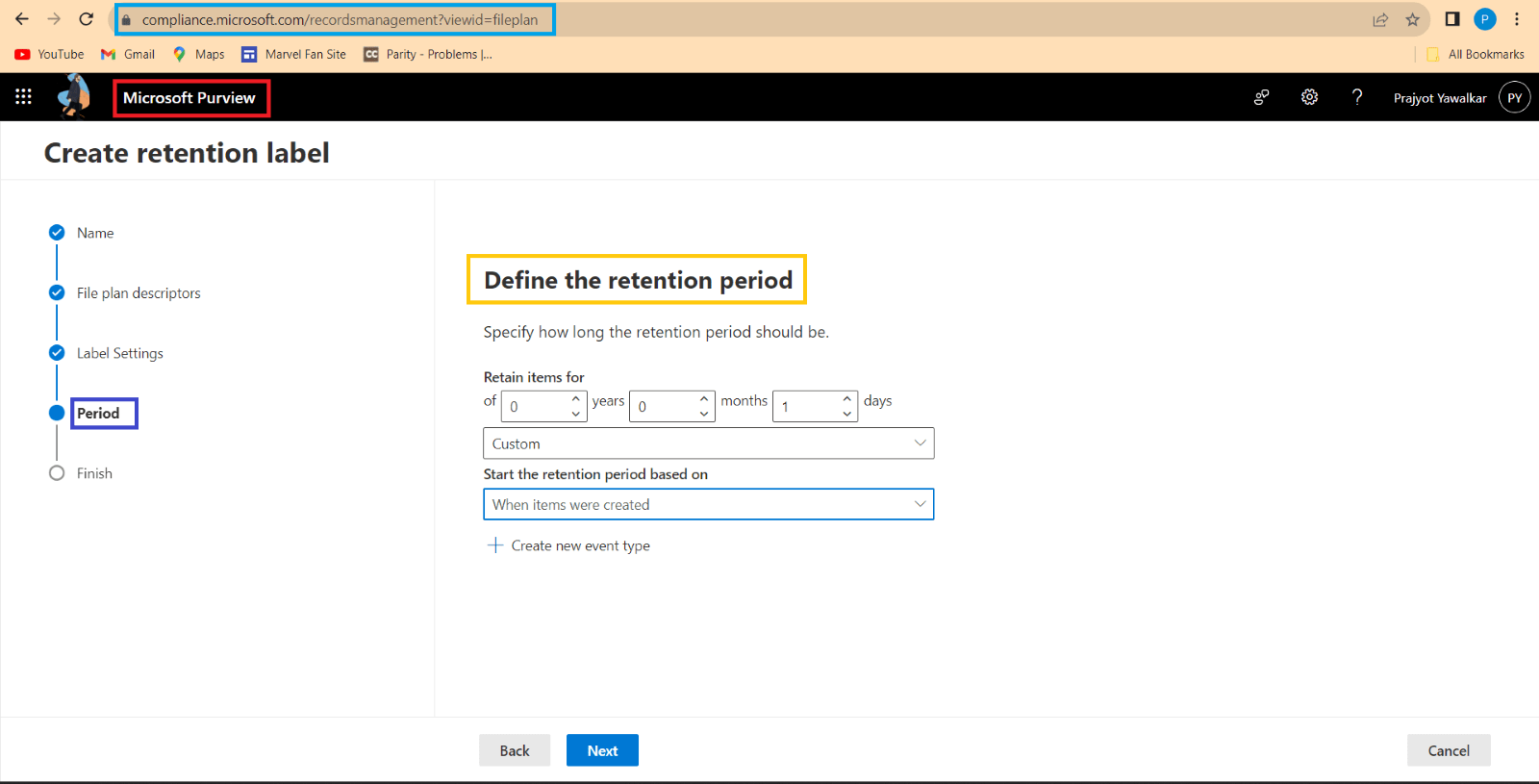 - Here, we select the retention period for how long the item should be retained for.