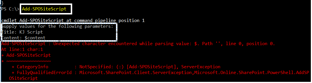 Add-SPOSiteScript – issue resolved – “Add-SPOSiteScript : Unexpected character encountered while parsing value: $. Path ”, line 0, position 0.” – New lesson learned 🙂